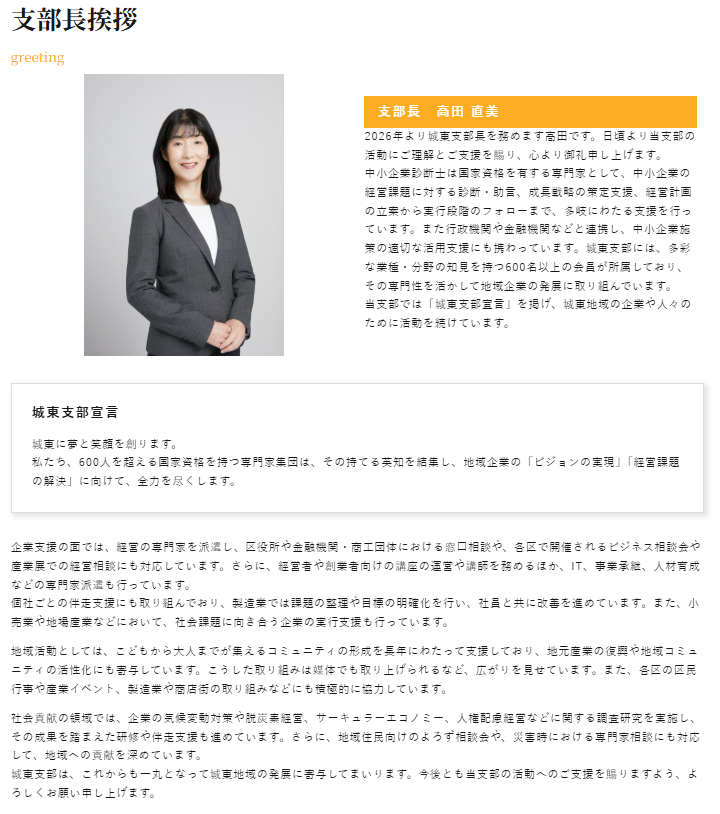 4月 1, 2026 / 最終更新日時 : 4月 5, 2026 nao 中小企業診断士 城東支部長挨拶 東京都中小企業診断士協会 城東支部の城東支部案内に支部長挨拶が掲載されました。 城東支部案内 | 一般社団法人東京都診断士協会 城東支部 東京都中小企業診断士協会の執行部メンバー挨拶に掲載されました。 執行部メンバー挨拶 – TOKYO SMECA ニュース デジタル コメントを残す コメントをキャンセルメールアドレスが公開されることはありません。 ※ が付いている欄は必須項目ですコメント ※ 名前 ※ メール ※ サイト Δ